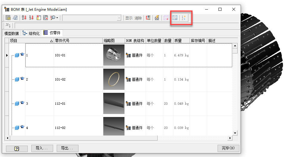 启用或禁用自动按顺序重新编号条目。注意:只有在“隐藏/显示数量为零的行”开关处于开启状态的情况下,才会启用此选项。启用此选项后,每个模型状态都可以有自己唯一的 BOM 表编号。