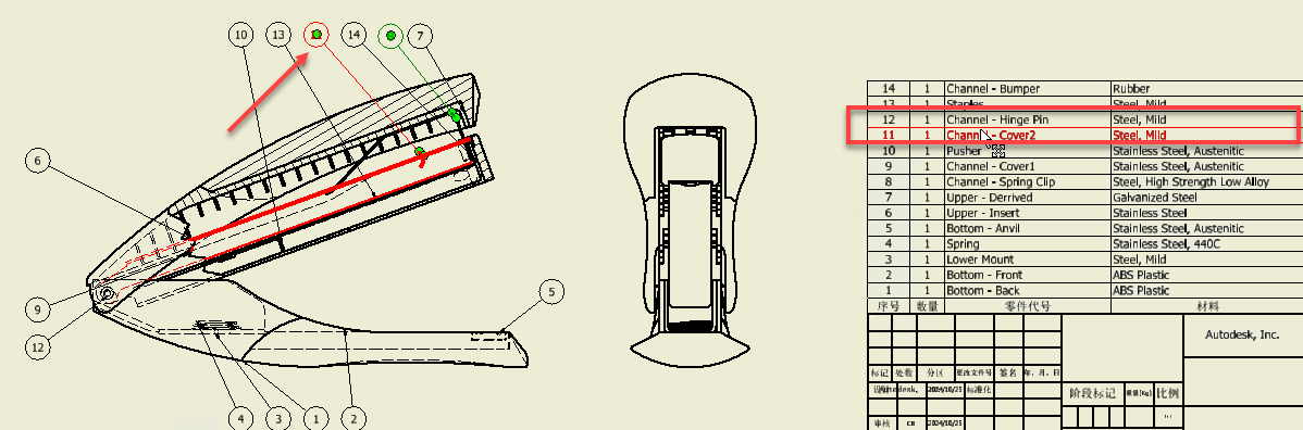 当您选择一个或多个明细栏行时,相应的引出序号将亮显。引出序号交叉亮显可帮助您轻松找到与选定明细栏行对应的引出序号,从而更轻松地找到带有引出序号的零件几何图元。