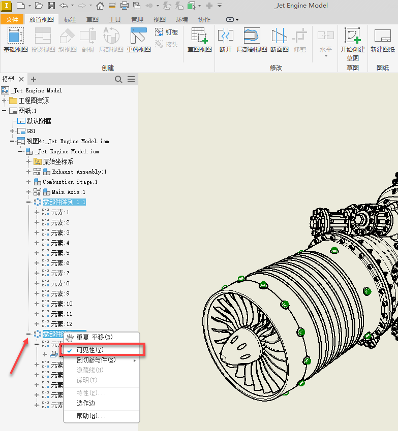 现在可以在工程图浏览器中选择零部件阵列。选择零部件阵列将亮显(仅限)该阵列的浏览器条目以及图形中构成该阵列(或阵列的阵列)的所有零部件。此外,在关联菜单中还添加了“可见性”和“选择边”选项。