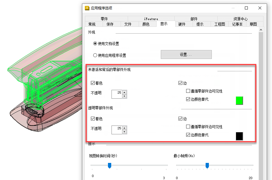 在画布中,透明零部件现在默认带边缘渲染,从而可以在视觉上将其与非活动零部件区分开来。在“应用程序选项”的“显示”选项卡上,可分别自定义非活动零部件和透明零部件的视觉样式。在对话框的“未激活和背后的零部件外观”和“透明零部件外观”区域中指定选项。
