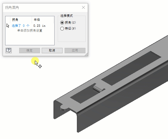 以前,使用“拐角圆角”和“拐角倒角”命令对拐角进行圆角和倒角处理时,需要逐个选择拐角边。现在,您可以使用窗口选择方法选择要进行圆角和倒角处理的边。