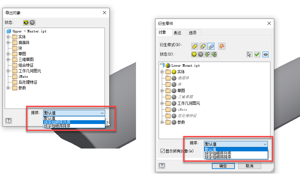 使用新的“排序”下拉列表可指定树节点(包括参数)的顺序。该菜单已添加到以下对话框: