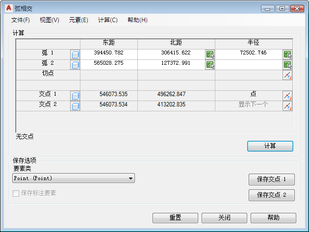 以下“圆弧交点”对话框显示用于构造和计算命令的对话框控件和组件。