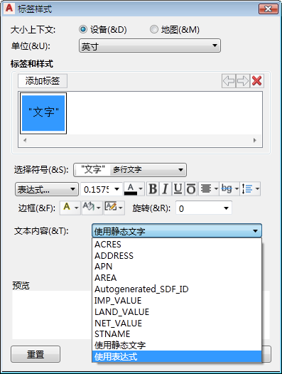 - 在“设计标签样式”对话框中,对于“文字内容”,选择“使用表达式”。
