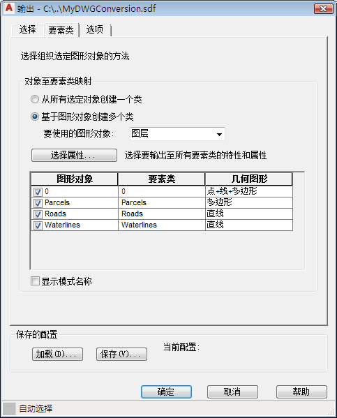在此指定的属性将指定给 SDF 文件中的所有要素类。因此,只选择适合所有要素类的属性。例如,可以选择常规特性,其中包括类似线宽的特性,而不是选择特定于每个要素类的对象数据特性。