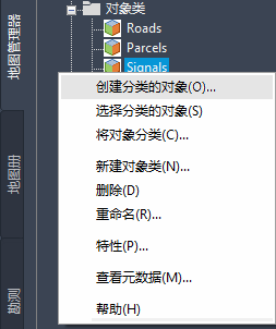- 在“任务”面板的“地图管理器”选项卡上,在“Signals”对象类上单击鼠标右键,然后单击“创建分类的对象”。