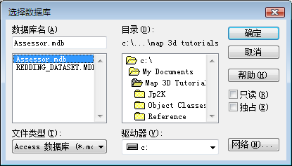 - 在“选择数据库”对话框中,浏览到样例文件,然后选择“Assessor.mdb”文件。