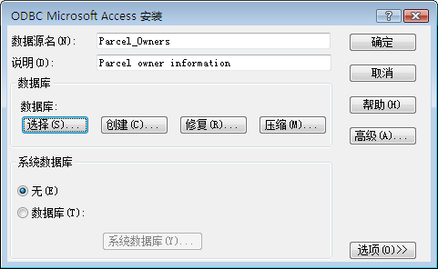 - 在“ODBC Microsoft Access 安装”对话框中,输入 Parcel_Owners 作为数据源名。