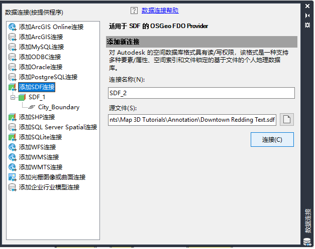 - 在仍处于打开状态的“数据连接”窗口中,在“通过提供程序进行数据连接”下再次选择“添加 SDF 连接”。