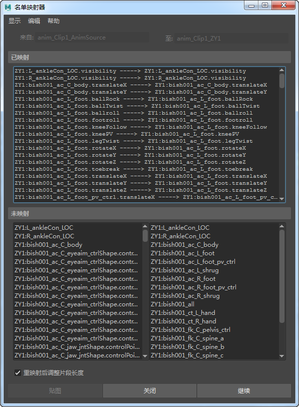 注: 如果未列出用于重新映射的动画或者“从名称空间重映射和创建片段”(Remap and Create Clip from namespace)选项处于禁用状态,这是因为场景中不存在用于重新映射的动画。