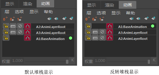 在“动画层编辑器”(Animation Layer Editor)中,可以指定需要默认的动画层堆栈显示还是需要反转的堆栈显示。