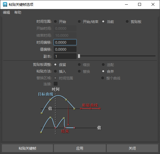 仅在“时间范围”(Time Range)设置是“剪贴板”(Clipboard)时可用。“整个曲线”(Entire Curve)设置将使用关键帧剪贴板的内容替换粘贴属性上的动画曲线,实际删除这些属性上的任何现有动画曲线并应用关键帧剪贴板中的新曲线。