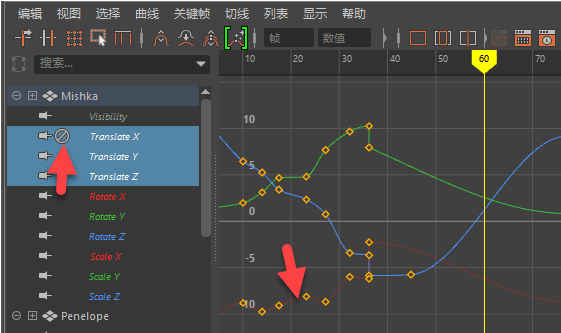 在“曲线图编辑器”(Graph Editor)中取消禁用通道