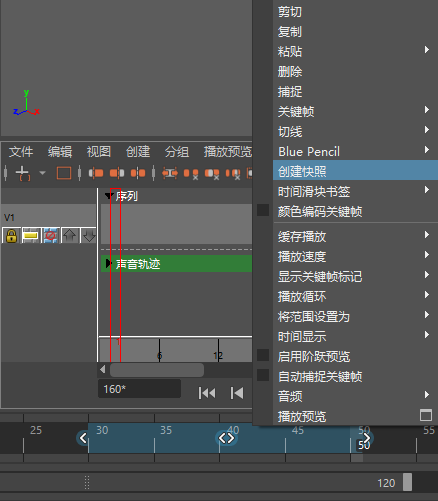 也可以从“时间滑块”(Time Slider) 关联菜单创建镜头。在“时间滑块”(Time Slider) 上选择某个范围后,可以在“时间滑块”(Time Slider) 上单击鼠标右键,然后从上下文菜单中选择“创建镜头”(Create Shot) 选项。这将基于“时间滑块”(Time Slider) 范围选择创建镜头。