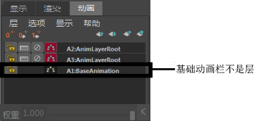 “基础动画”(BaseAnimation)栏可以锁定时,将无法禁用和单放该栏或将其设置为层的子对象。如果要禁用或单放由“基础动画”(BaseAnimation)栏表示的未分层的动画,则必须先将其提取到层。请参见将动画提取到动画层或从动画层提取动画。