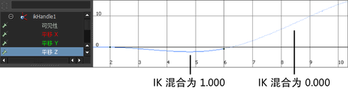 例如,当显示 IK 控制柄的“平移 X”(Translate X)、“平移 Y”(Translate Y)或“平移 Z”(Translate Z)通道的动画曲线时,该曲线在“IK 融合”(Ik Blend)为 1.000 时显示为实线,在“IK 融合”(Ik Blend)为 0.000 时显示为虚线。换句话说,实线显示的是 IK 控制柄控制关节链动画的位置,虚线显示的是 FK(设定关键帧的关节旋转)控制动画的位置。
