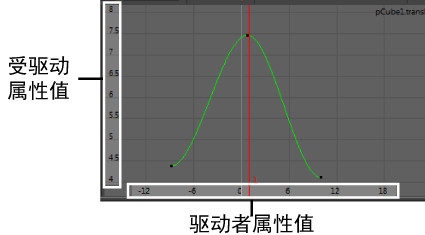 “曲线图编辑器”(Graph Editor)中的曲线显示受驱动对象和驱动者对象值之间的关系。左侧数字列列出了受驱动属性值,而底行列出了驱动者属性值。