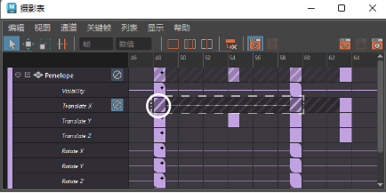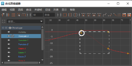 在“曲线图编辑器”(Graph Editor)中,“禁用”(Mute)会显示在大纲视图中当前动画通道名称的下方,并且在视图区域中会显示一条带关键帧的禁用曲线。