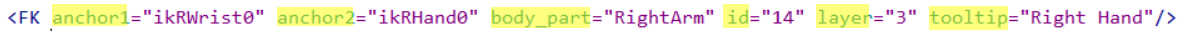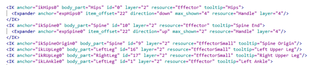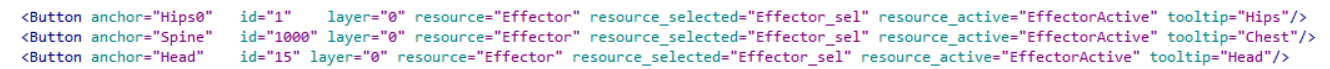 您可以通过在基本文本编辑器(如记事本或 Programmer's Notepad)中编辑 CharacterControls.xml 文件,自定义 HumanIK 窗口的“控制”(Controls)和“自定义绑定”(Custom Rig)选项卡。您也可以通过更改布局来编辑 HumanIK 选项卡的外观,以适应您的工作流或动画绑定。