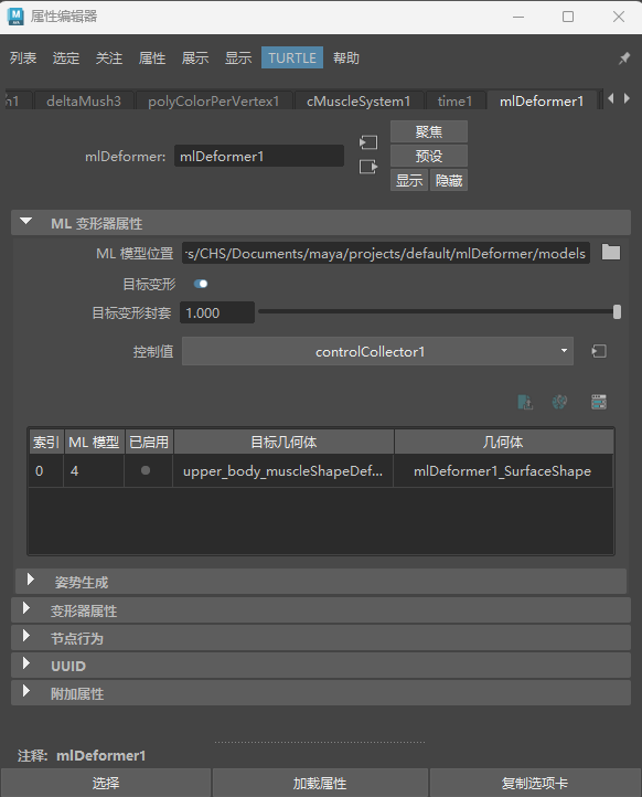 “属性编辑器”(Attribute Editor)中的“ML 变形器”(ML Deformer)选项卡