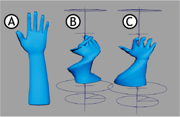 比较:手部模型 (A),先扭曲后挤压变形的手部模型 (B),变形顺序颠倒(先挤压后扭曲)的手部模型 (C)