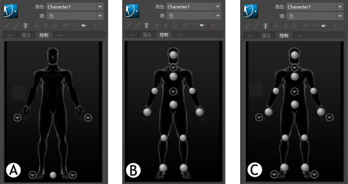 三种不同的角色控制模板:A.CharacterControlsConfig.xml、B.CustomRigControlsConfig.xml 和 C.FullRigControlsConfig.xml