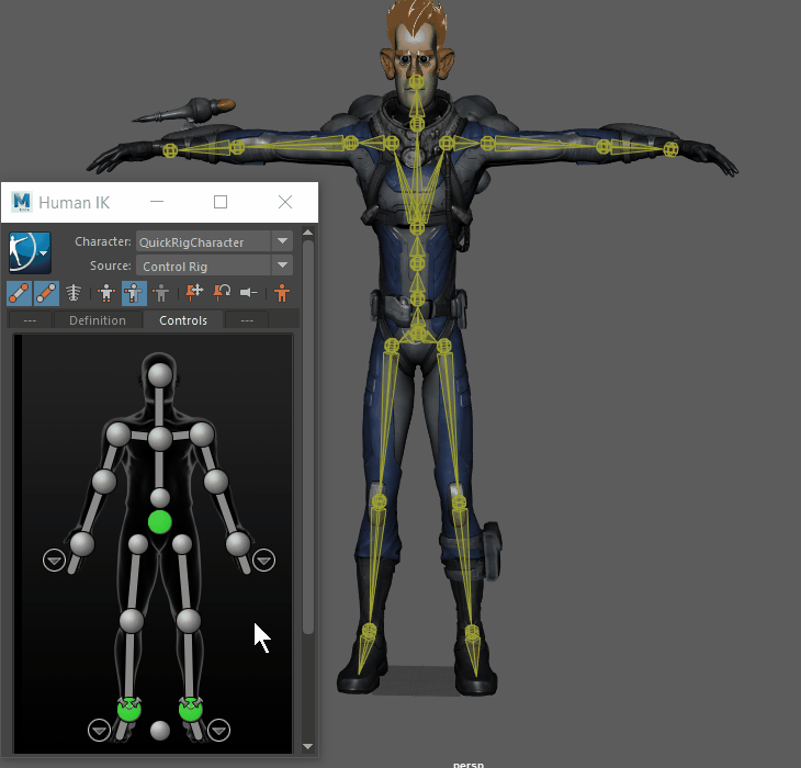在该模式下,您可以操纵一个效应器,而无需解决角色的其他部位,然后使用“HumanIK 控制”(HumanIK Controls)来调整角色的其他部位对于该效应器所能达到的程度。
