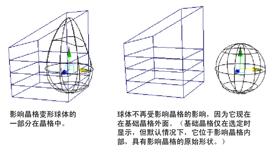晶格变形器的变形效果通常取决于对象是否在基础晶格(默认名称:ffdnBase)的内部进行变形。如果对象完全位于基础晶格的外部,变形效果将终止。效果之所以会终止,原因就在于晶格变形器计算效果时依据的是基础晶格、影响晶格和基础晶格内部对象位置之间的空间关系。如果对象位于基础晶格外部,Maya 将无法计算效果。同样地,如果对象只有一部分位于基础晶格内部,那么只有位于基础晶格内部的对象组件(例如,CV)会受到影响晶格的影响。