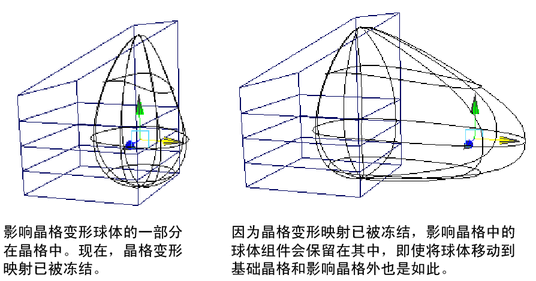 冻结晶格变形映射将冻结影响晶格与其内部所有组件之间的关系。冻结时位于影响晶格内部的对象组件(例如,CV)将固定在晶格内部,且只受到影响晶格的更改所影响。即使移动了基础晶格而造成这些组件不再处于基础晶格内部,这些组件本身仍将受到影响晶格的影响。但是,移动对象时也将移动影响晶格外部的组件,从而造成对象上的变形效果。