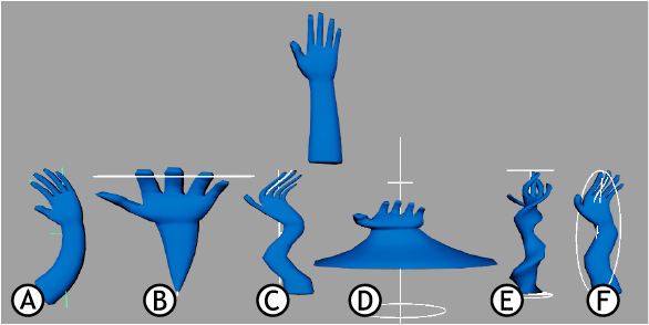 应用于手的非线性变形器:A。弯曲,B。扩张,C。正弦,D。挤压,E。扭曲,F。波浪(Wave)