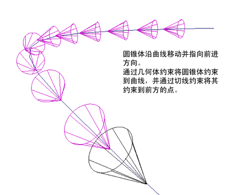 切线约束可约束对象的方向,以使某个对象沿曲线移动时,该对象始终指向曲线的方向。曲线提供对象运动的路径,对象会调整自身的方向以指向曲线。切线约束用于使对象跟随曲线的方向,例如过山车会跟随轨迹的方向。