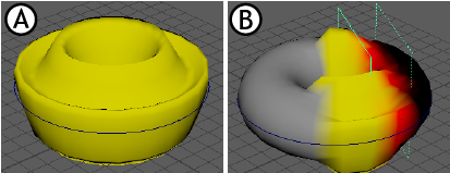 应用波浪变形器的圆环 A. 应用“权重可视化”(Weights Visualization) B.应用“权重可视化”(Weights Visualization)和“基本体衰减”(Primitive Falloff)