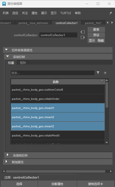 “属性编辑器”(Attribute Editor)的“控件收集器”(Control Collector)选项卡