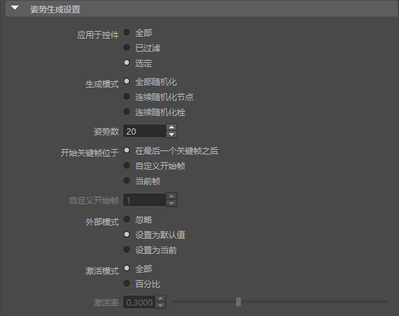 姿势生成模式:A. 全部随机化(Randomize All Together) B. 连续随机化节点(Randomize Nodes Consecutively) C. 连续随机化栓(Randomize Plugs Consecutively)