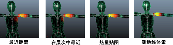 下图使用绘制蒙皮权重工具,比较四种不同绑定方法下指定给角色左臂关节的默认权重的效果。亮黄色表示绑定效果最强的区域,黑色表示不受影响的区域。“最近距离”(Closest Distance)和“在层级中最近”(Closest In Hierarchy)具有类似的效果,“热量贴图”(Heat Map)和“测地线体素”(Geodesic Voxel)显示关节处的绑定效果更强。若要执行此类比较,请参见使用“绘制蒙皮权重”(Paint Skin Weights)工具测试蒙皮绑定。