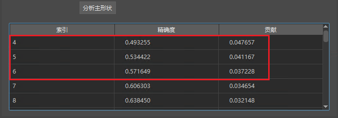 - 查看通过分析填充的表。白色行表示将在训练中使用的主形状。形状数将与“主形状精确度”(Principal Shapes Accuracy)设置中设定的形状数量相同,但不超过“主形状限制”(Principal Shapes Limit)。