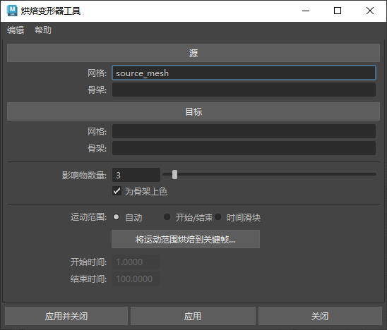 注: “烘焙变形到蒙皮权重”(Bake Deformation to Skin Weights)不会创建新类型的变形器,也不会修改源角色上现有变形器的结果。