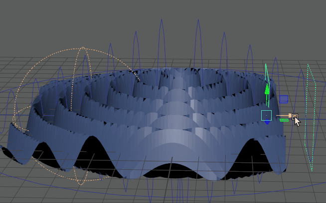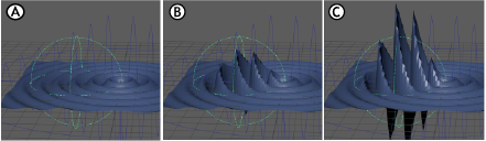 “融合衰减”(Blend Falloff)属性编辑器构件包含一个表,您可以在其中添加各种衰减效果,然后将它们组合在一起以生成复杂的结果。