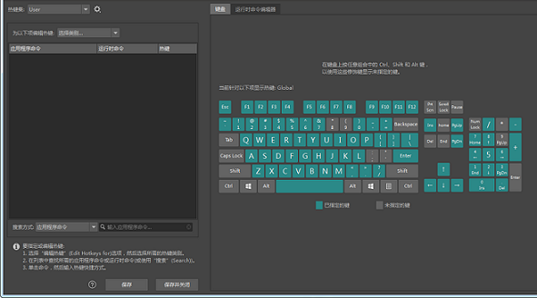 通过此编辑器,可以将预定义命令、脚本或标记菜单的热键或键盘快捷方式指定给键和键组合。