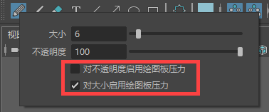 工具(位于 Blue Pencil 工具栏中)上单击鼠标右键,然后激活“对不透明度启用绘图板压力”(Enable Tablet Pressure for Opacity)和“对大小启用绘图板压力”(Enable Tablet Pressure for Size)选项。