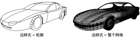 当“边样式”(Edge Style)为“轮廓”(Outlines)时,曲面边和轮廓渲染为轮廓。(使用“细节边”(Detail Edges)也可将尖锐的多边形边渲染为轮廓。)