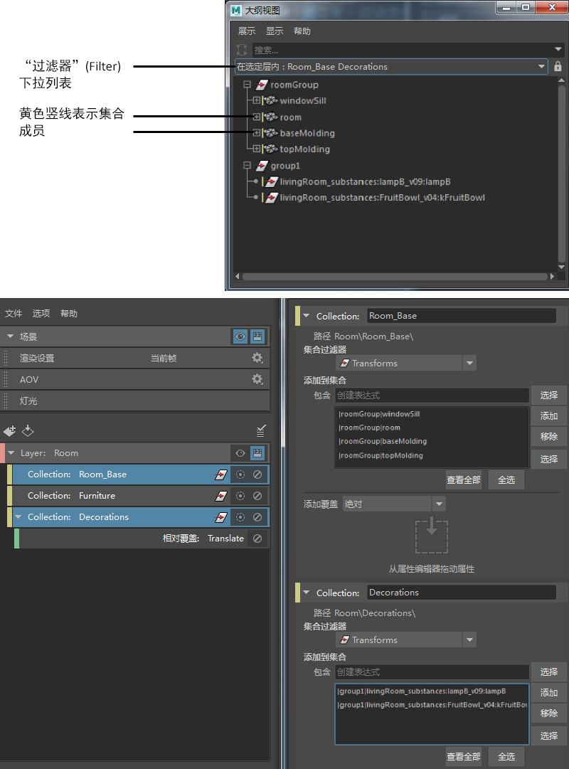在大纲视图中,所有渲染设置成员均用黄色竖线表示。在本示例中,windowSill、room、baseMolding 和 topMolding 是集合的所有成员。由于它们是 roomGroup 层次的子对象,因此若要列出这些节点,则还必须在树中列出其父节点。所以,它们使用黄色竖线加以区分。这同样适用于 group1 层次的子对象 lampB 和 kFruitBowl。