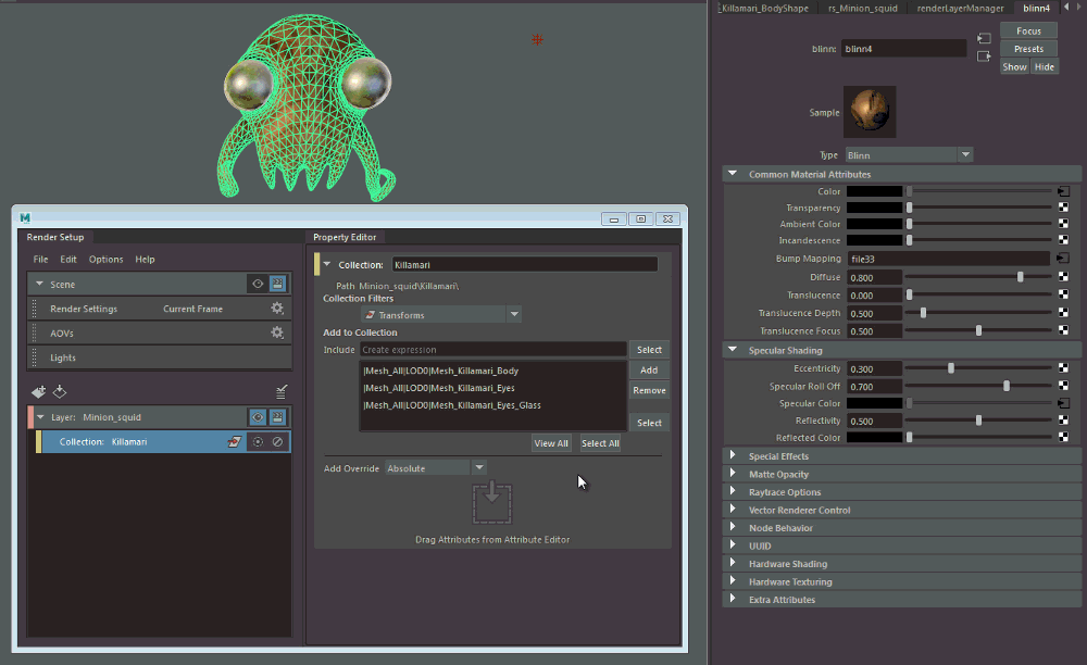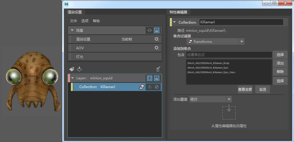 在本示例中,渲染层 Minion_squid 用集合 Killamari 填充。Mesh_Killamari 身体、眼睛和眼睛玻璃体变换节点已添加到集合中,因此该角色的身体、眼睛和眼睛玻璃体在视口中可见。