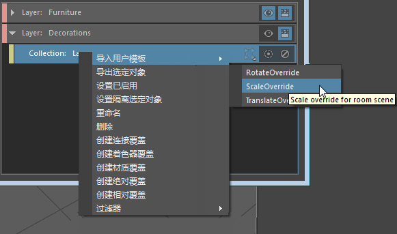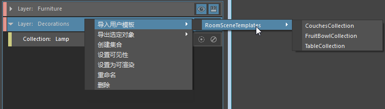 在层上单击鼠标右键,菜单中将仅列出集合类型的模板。此处未列出覆盖模板。子文件夹 RoomSceneTemplates 存在于全局模板目录内,因此将相应地创建子菜单。