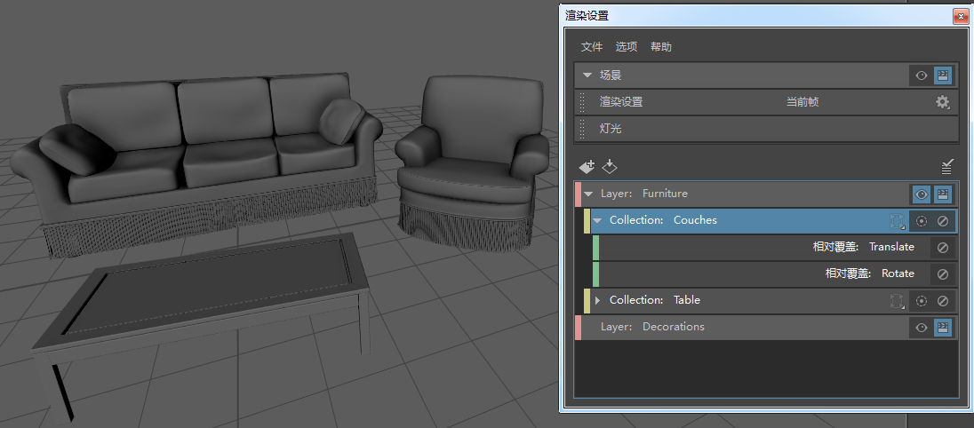 选择“沙发”(Couches)以导出“沙发”(Couches)集合,其平移和旋转覆盖包含在导出的模板中。也可以仅导出单个覆盖;例如,平移。