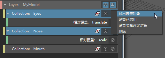 在本例中,“眼”(Eyes)和“鼻子”(Nose)集合导出为 .json。