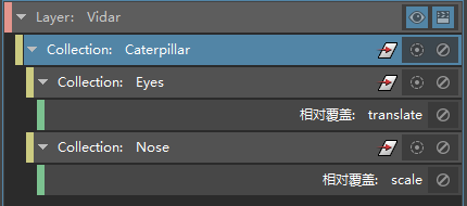然后,将这两个集合作为“毛虫”(Caterpillar)父集合的子集合导入,同时也导入与其关联的覆盖。这样,毛虫模型将显示在层中,并且毛虫的眼和鼻子分别可以平移和缩放。