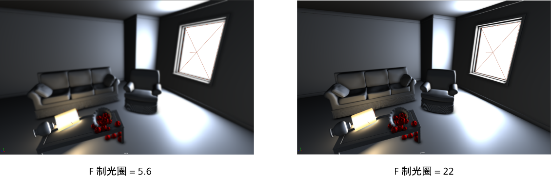调整“景深 > F 制光圈”(Depth of Field > F Stop)值以增大或减小景深量。使用较高的 fStop 值(例如,f-16、f-22、f-32)可以获得较深的景深,更多的前景和背景会在焦点上。使用较小的 fStop 值(例如,f-2.8、f-4、f-5.6)可以获得较浅的景深,更多的前景和背景会超出焦点且模糊。