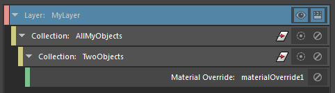 在本例中,由于所有对象共享同一着色器,因此无法如同示例 2 中一样覆盖该着色器上的属性。否则,所有对象都将应用相同的覆盖。您应创建一个材质覆盖而非着色器覆盖,因为着色器覆盖并不特定于集合,而是应用于同一层中共享相同的初始着色器指定的所有对象。