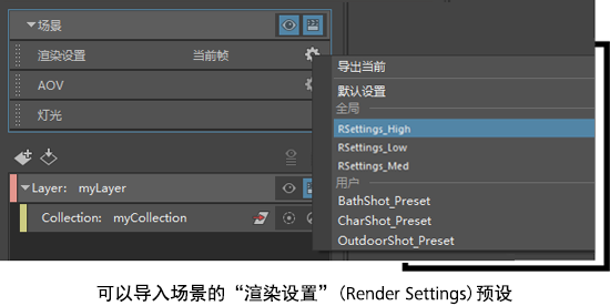 | 将设置保存为预设 | 导出渲染设置 |